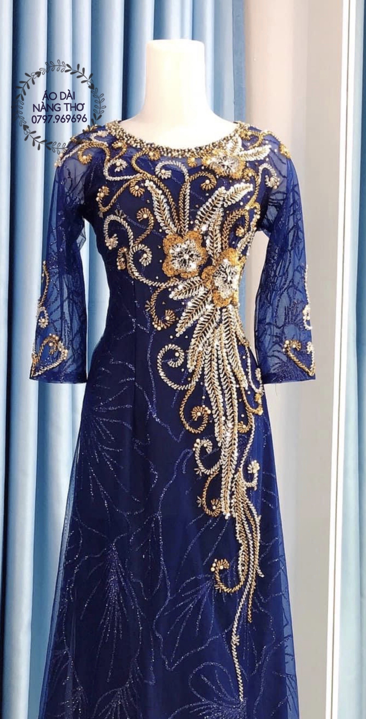 Áo dài cho mẹ màu xanh đen kết hạt sang trọng nổi bật