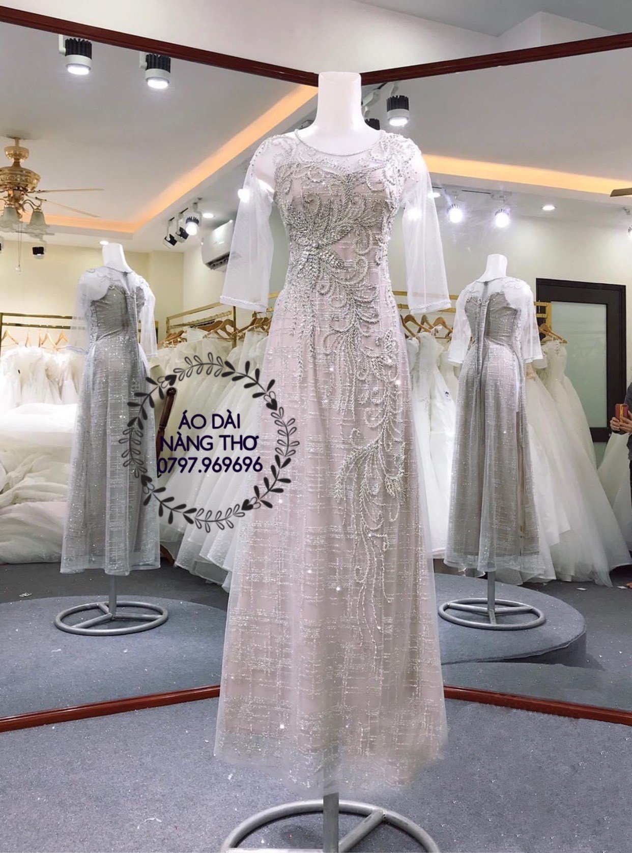Áo dài đi họ màu xám bạc sang trọng. Đảm bảo các chị sẽ rất nội bật trong mẫu thiết kế này