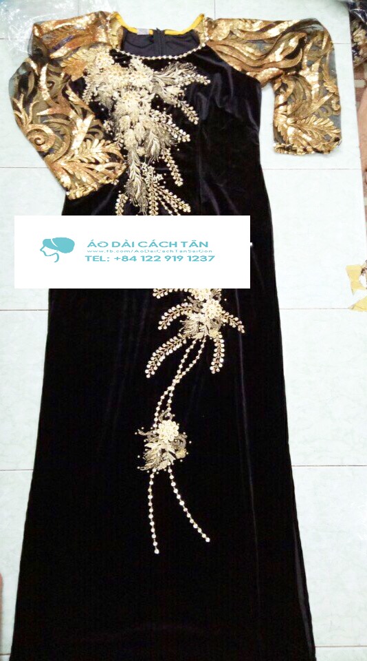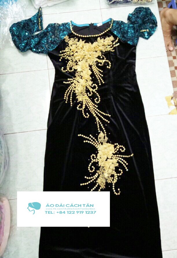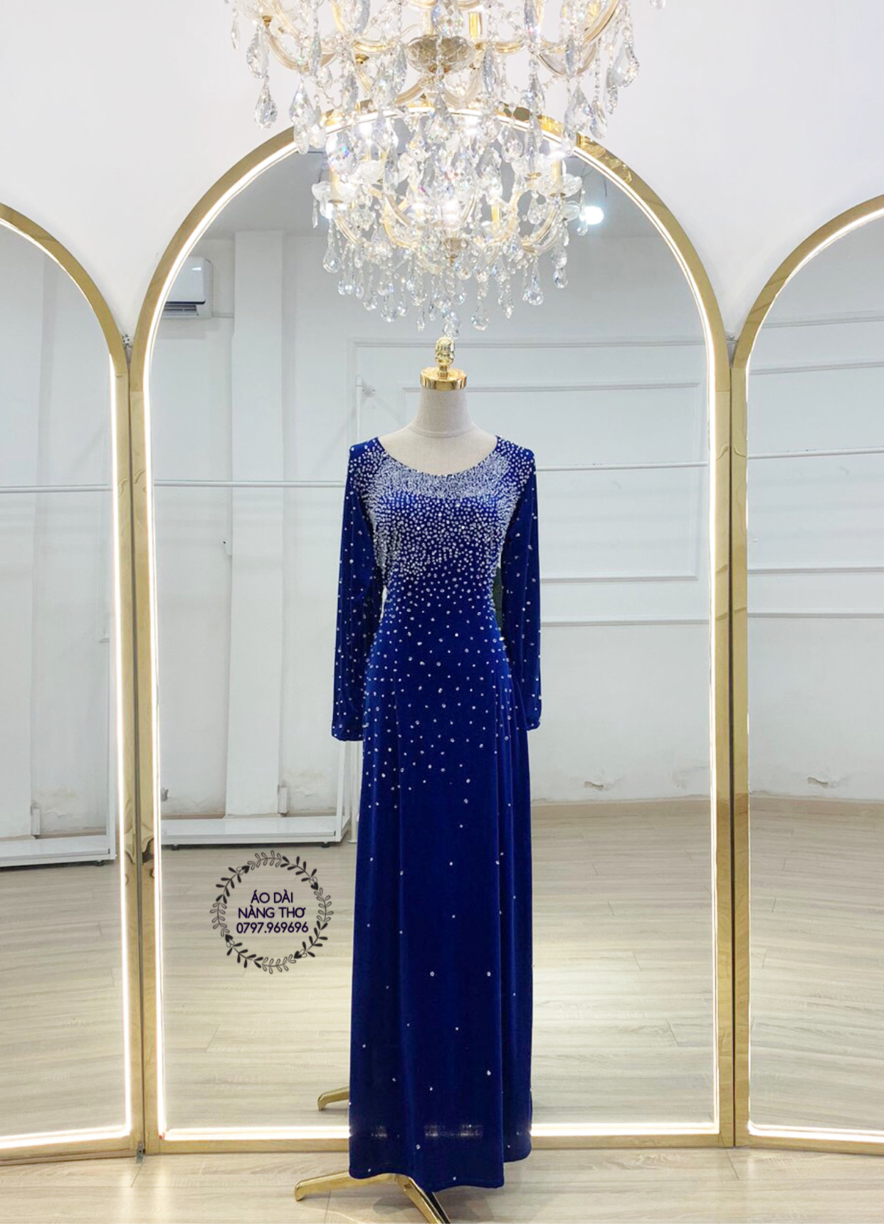 Áo Dài nhung xanh dương kết hạt nổi bật