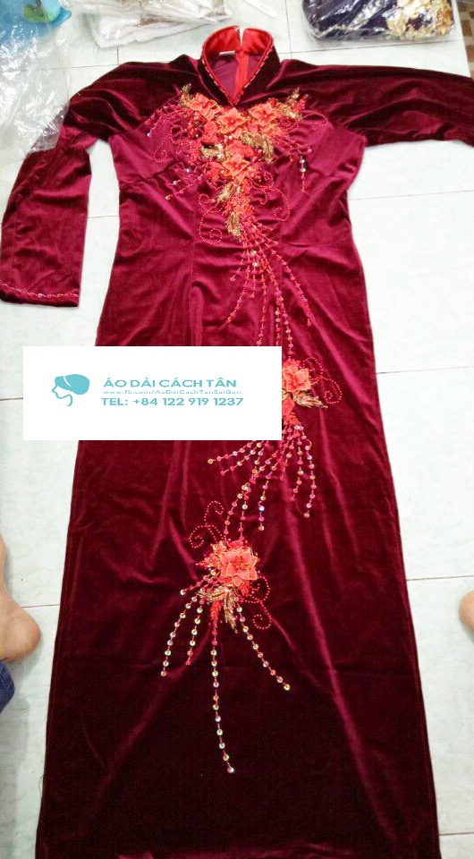 Áo Dài nhung đỏ đô đính hạt sang trọng.