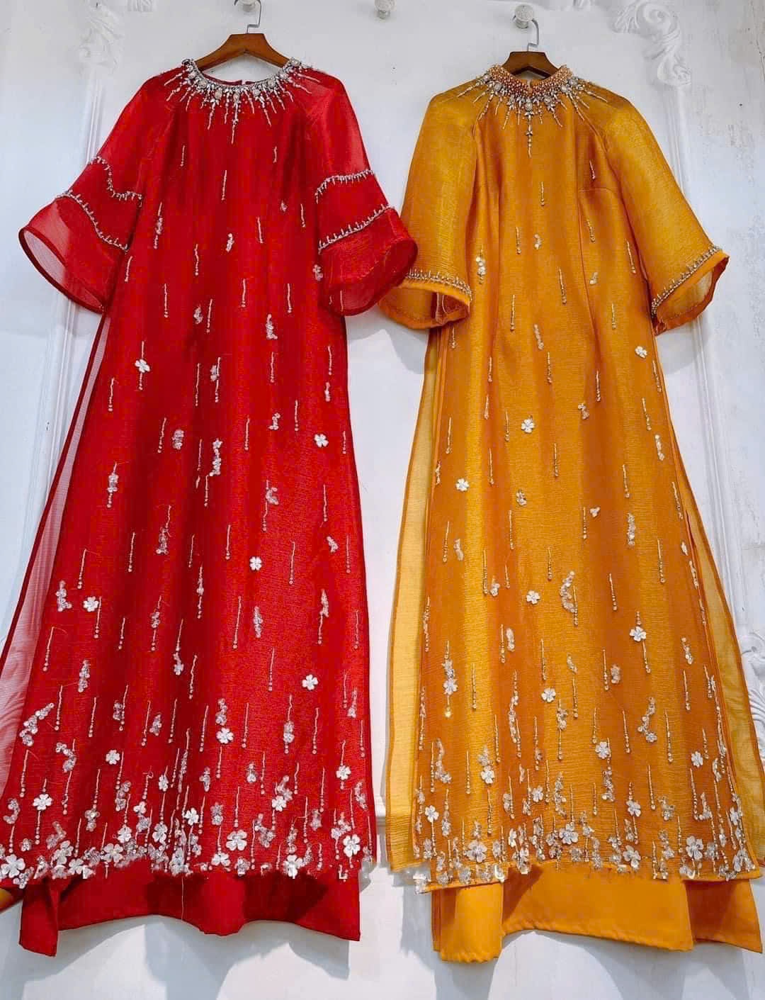 • Áo Dài Bà Sui Tơ Xước Đính Đá Trẻ Trung Hiện Đại