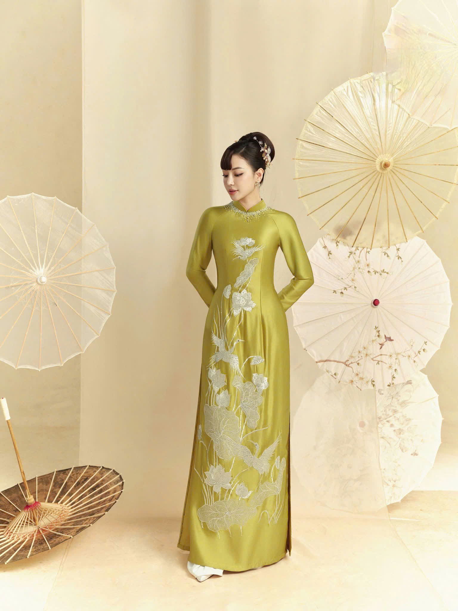 • Áo Dài Bà Sui Lụa Cao Cấp Họa Tiết Hạc Phối Hoa Sang Trọng