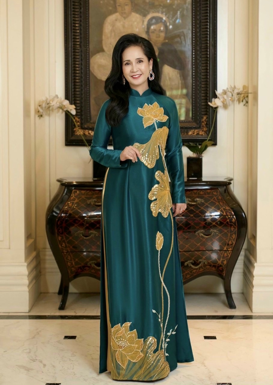 • Áo Dài Bà Sui Lụa Cao Cấp Màu Xanh Vẽ Hoa Sen Sang Trọng