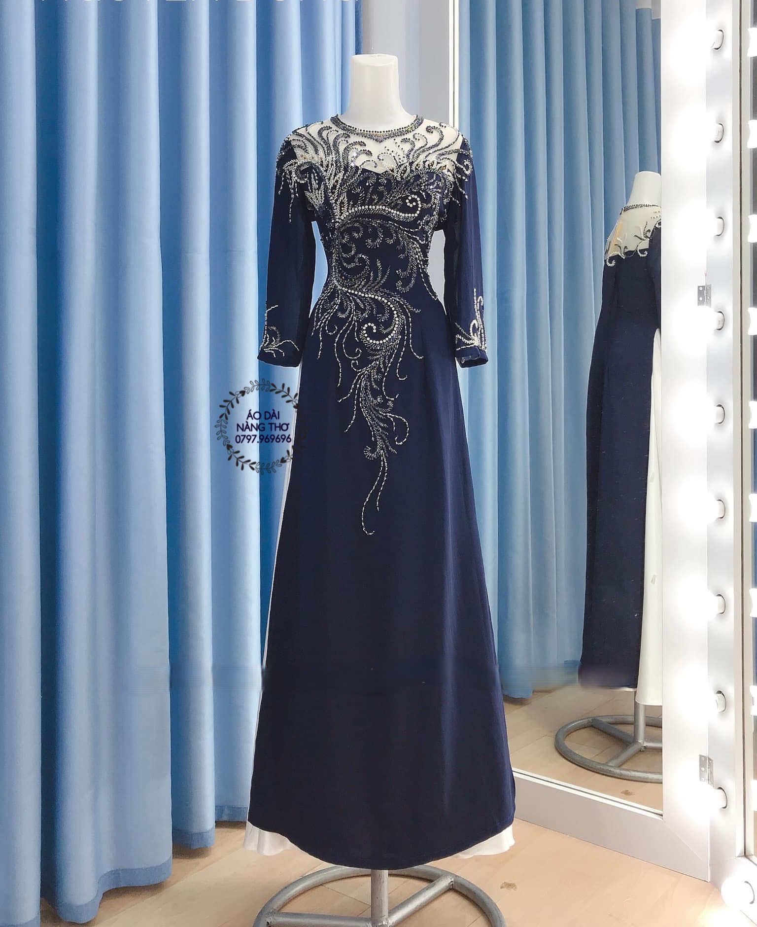 • Áo Dài Bà Sui Lụa Xanh Đen Kết Họa Tiết Cao Cấp