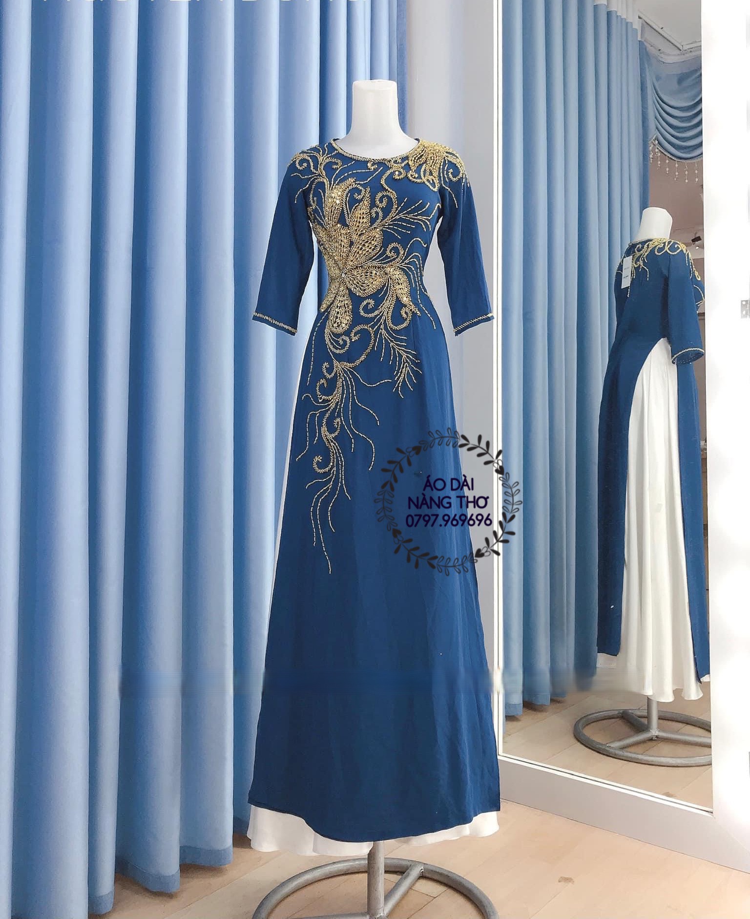 • Áo Dài Bà Sui Lụa Xanh Kết Họa Tiết Cao Cấp