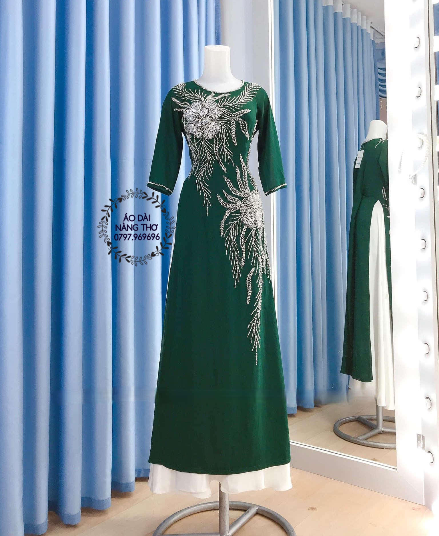 • Áo Dài Bà Sui Lụa Xanh Lá Kết Hạt Cao Cấp