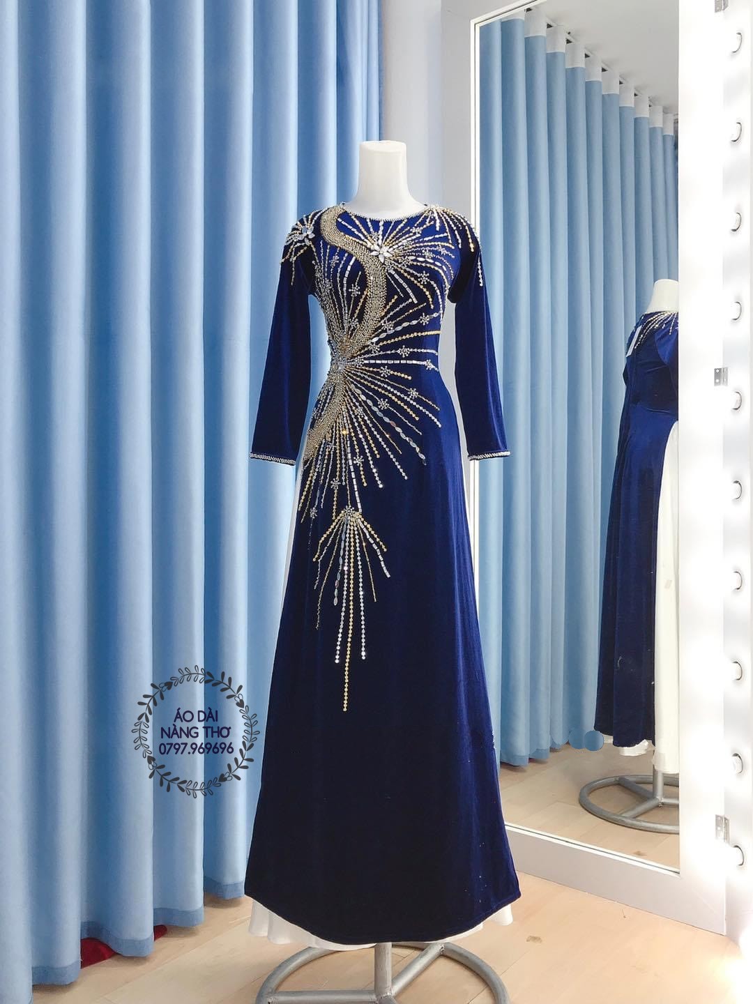 • Áo Dài Bà Sui Nhung Xanh Đen Đính Hạt Cao Cấp