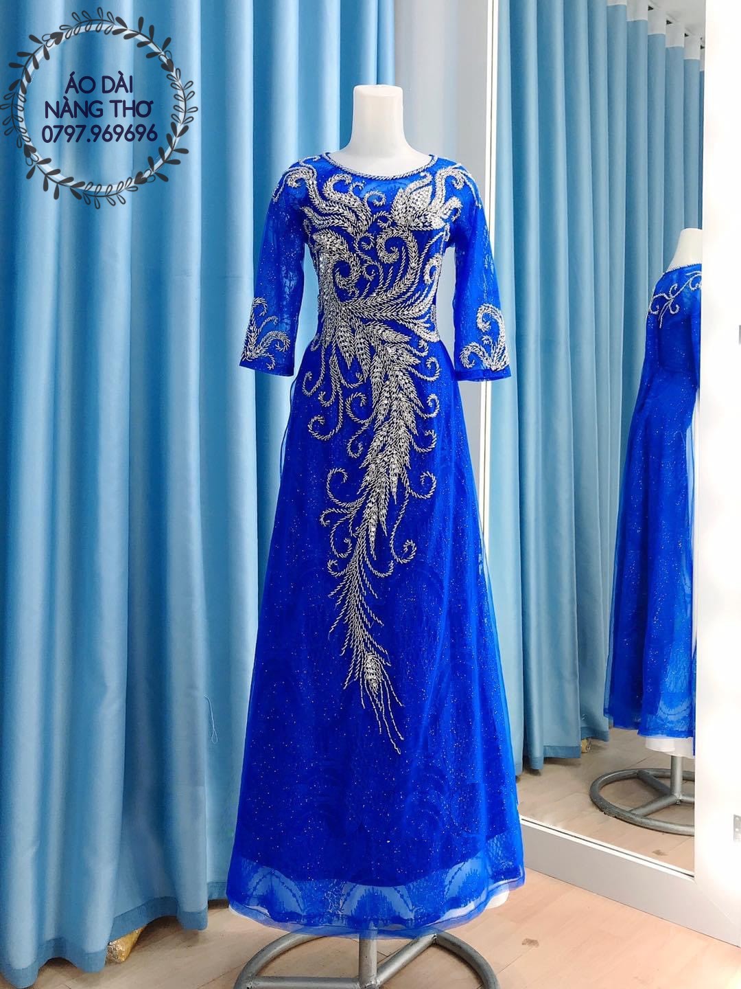 • Áo Dài Bà Sui Ren Lưới Xanh Dương Đính Hạt Cao Cấp