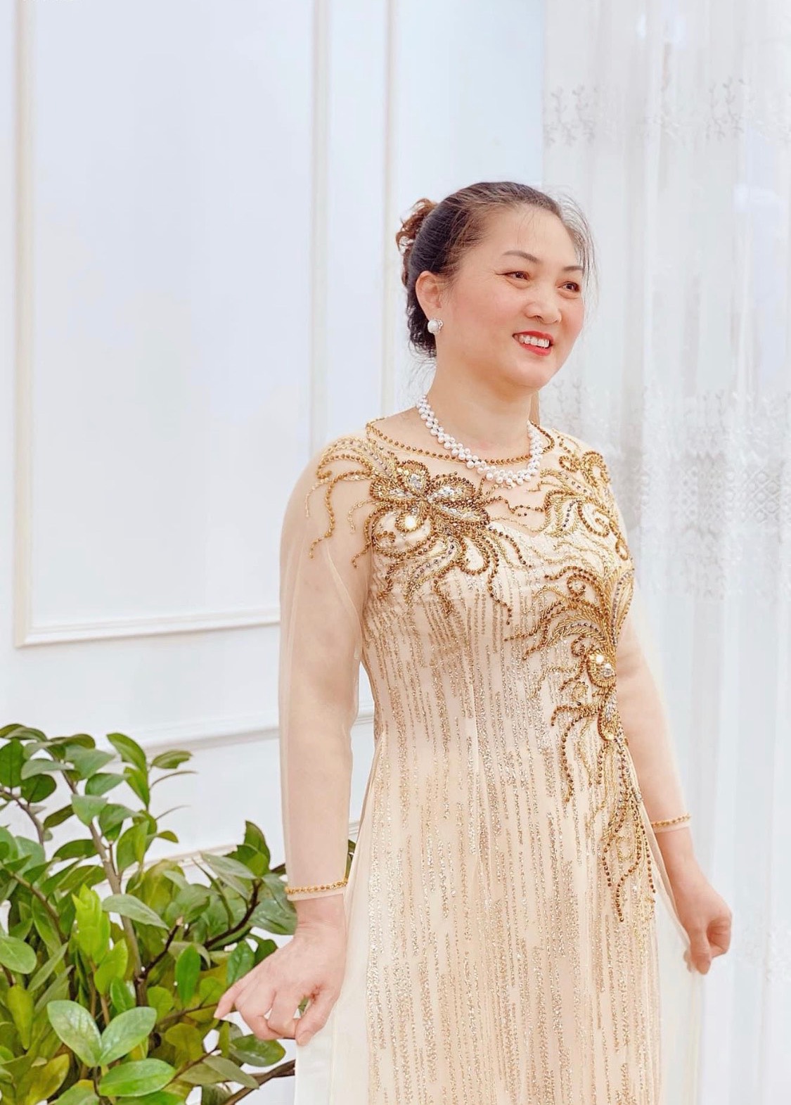 • Áo Dài Bà Sui Ren Vàng Kết Hạt