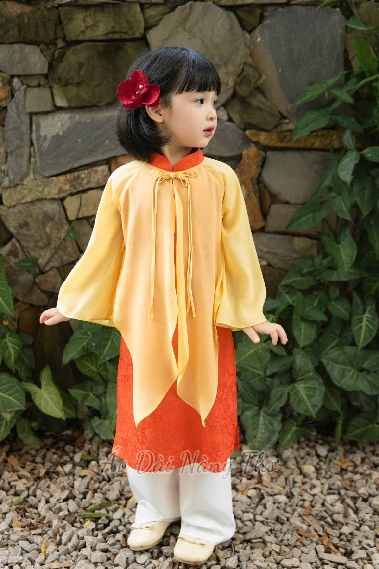 • Áo Dài Bé Gái Lụa Cam Xẻ Tà Tân Thời