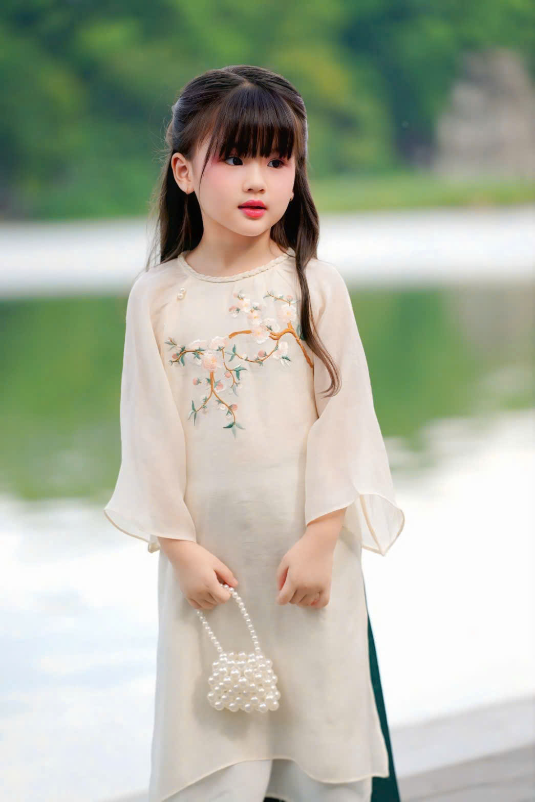 • Áo Dài Bé Gái Voan Lụa Đỏ Họa Tiết Thêu
