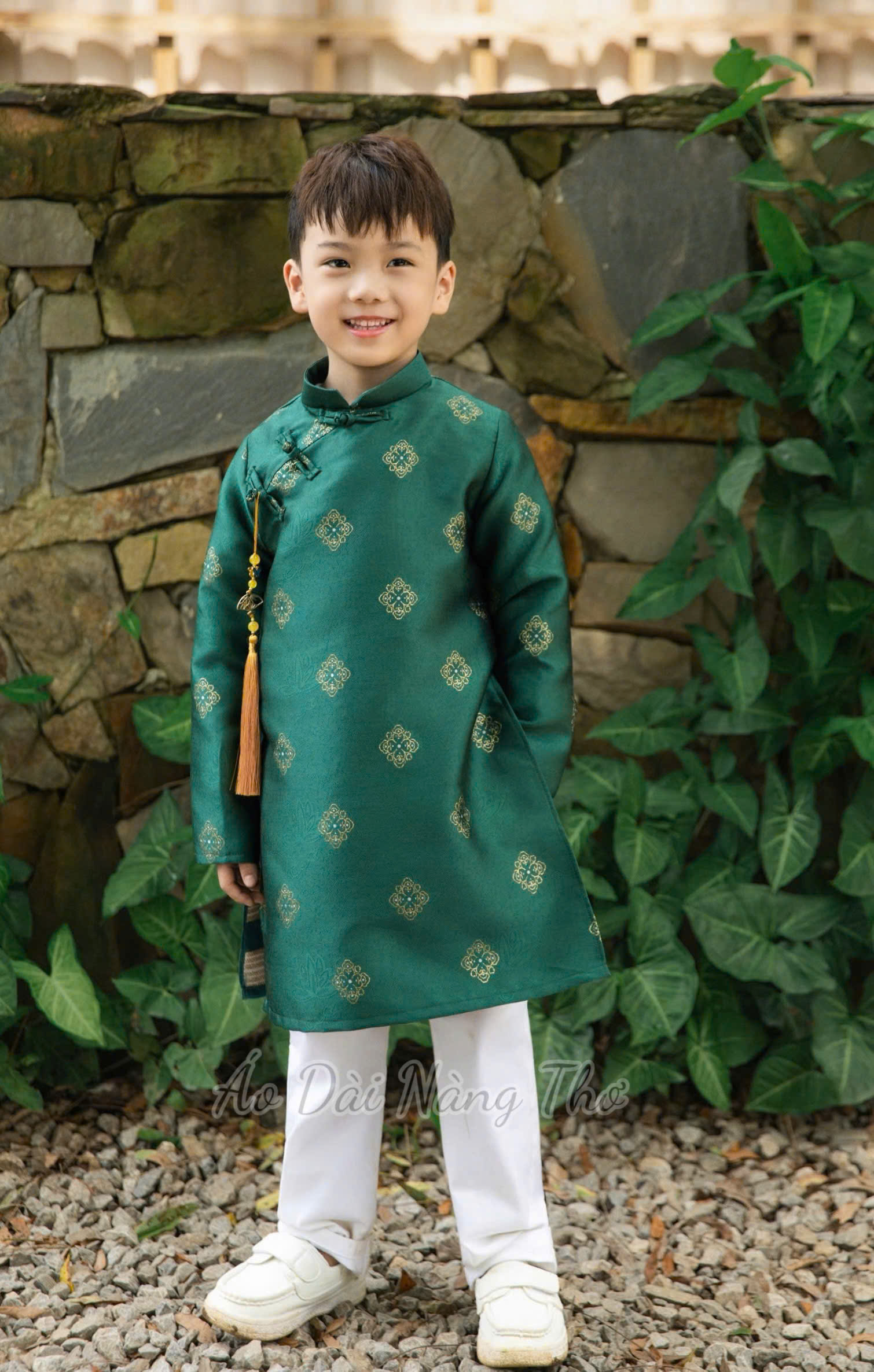 • Áo Dài Bé Trai Tafta Xanh Rêu Kèm Dây Tua Rua