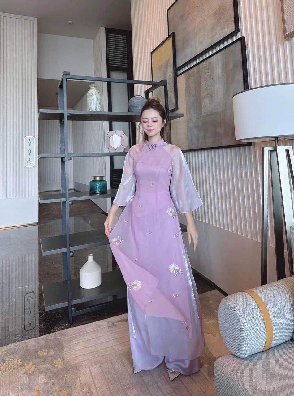 • Áo Dài Cách Tân Tím Thêu Hoa Nổi Bật
