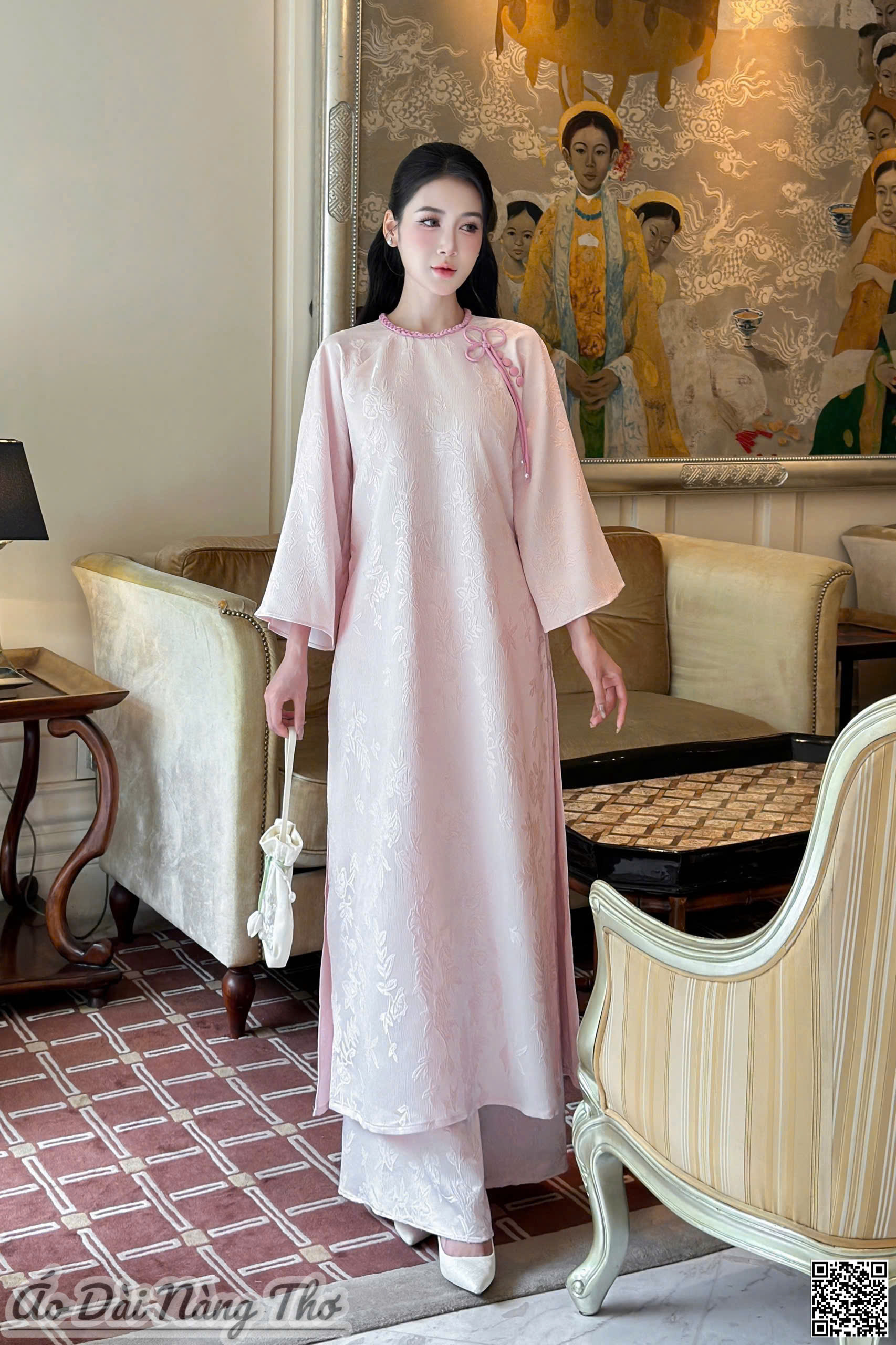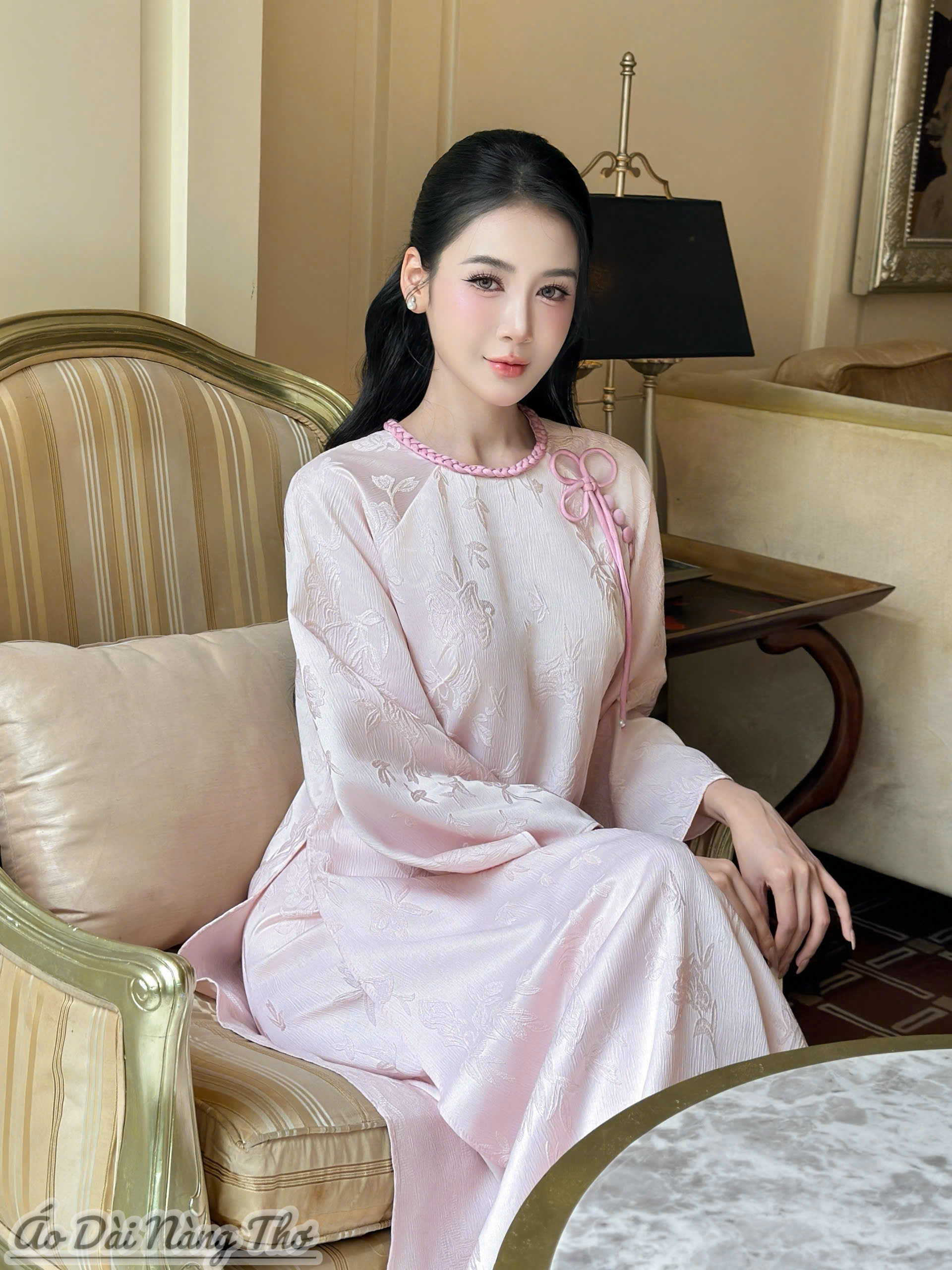 • Áo Dài Cách Tân Gấm Tafta Vân Nổi Đính Nơ