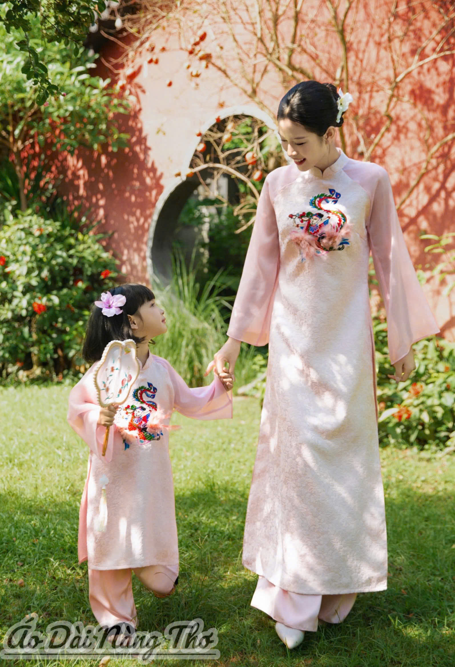 • Áo Dài Cách Tân Lụa Gấm Hồng Họa Tiết Thêu (Không bao gồm áo bé)