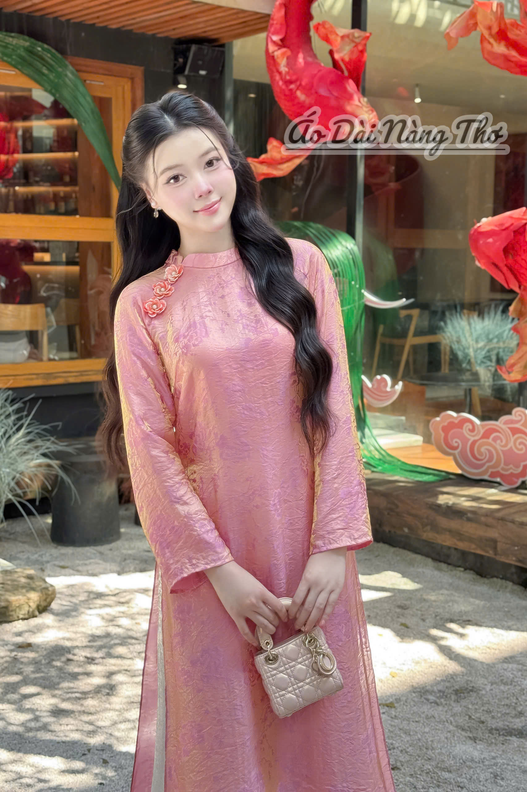 • Áo Dài Cách Tân Lụa Hồng Đính Hoa Xinh Xắn