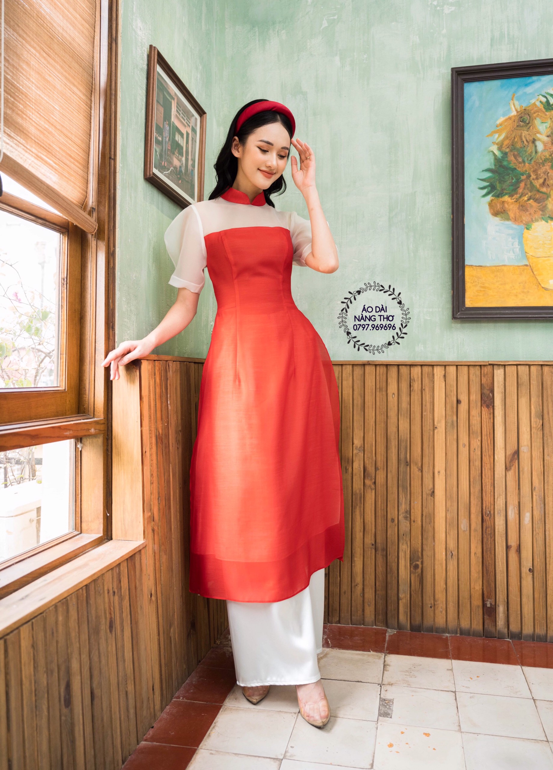 • Áo Dài Cách Tân Lửng Đỏ Tơ Tay Lửng