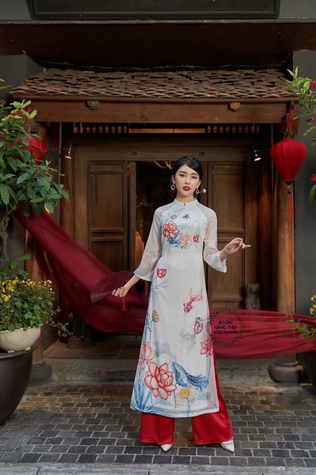 • Áo Dài Cách Tân Lửng Trắng Tơ Hoạ Tiết Sen