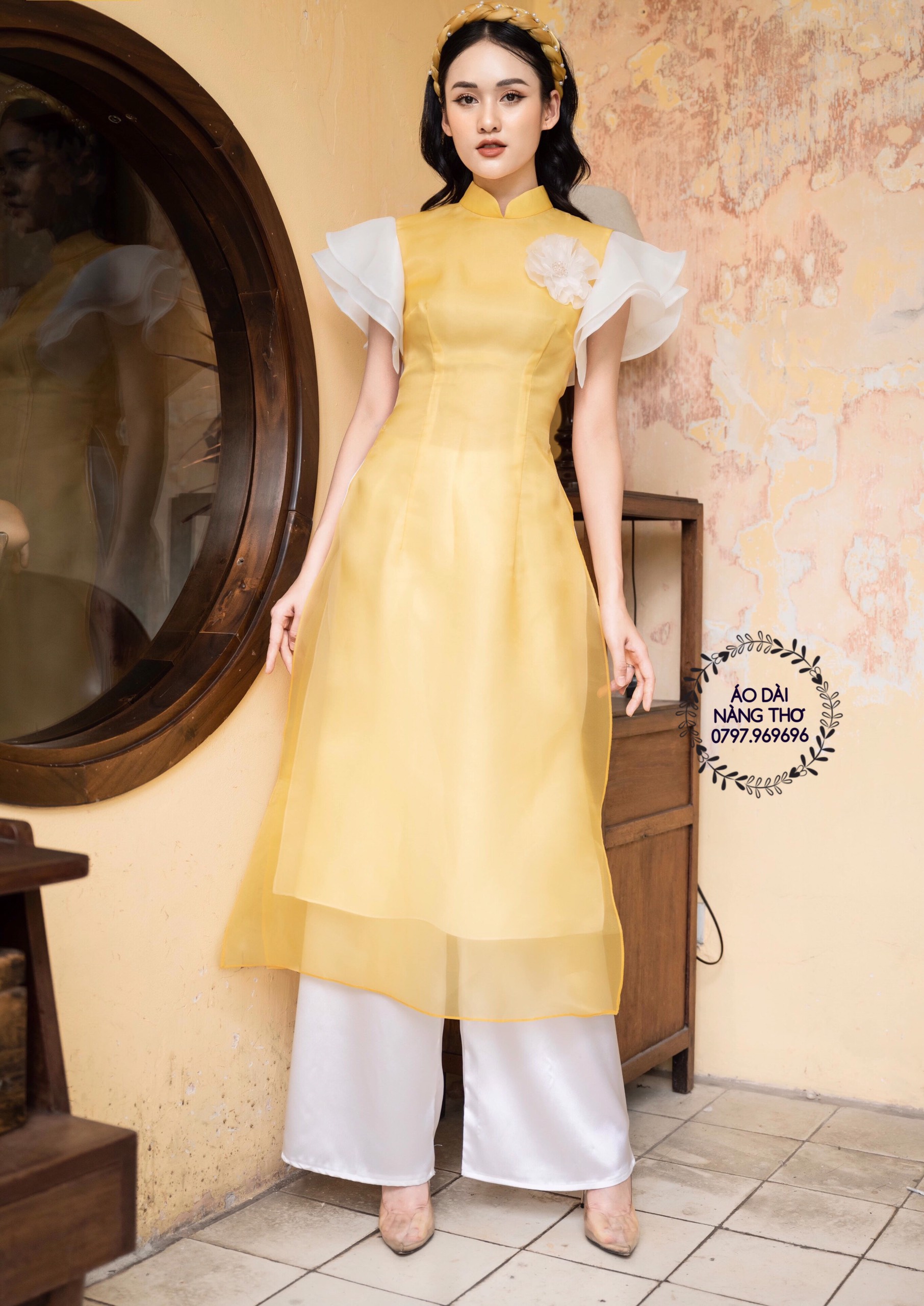 • Áo Dài Cách Tân Lửng Vàng Tơ Tay Phồng