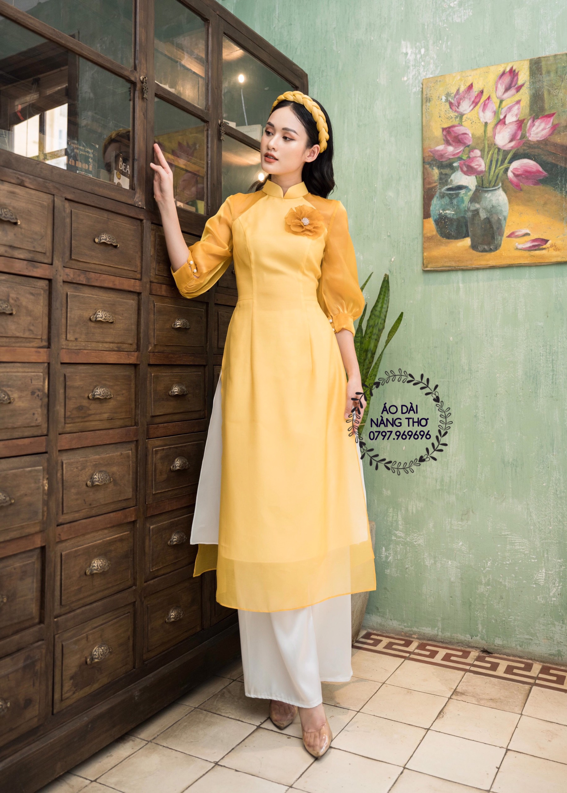 • Áo Dài Cách Tân Lửng Vàng Tơ Tay Phồng