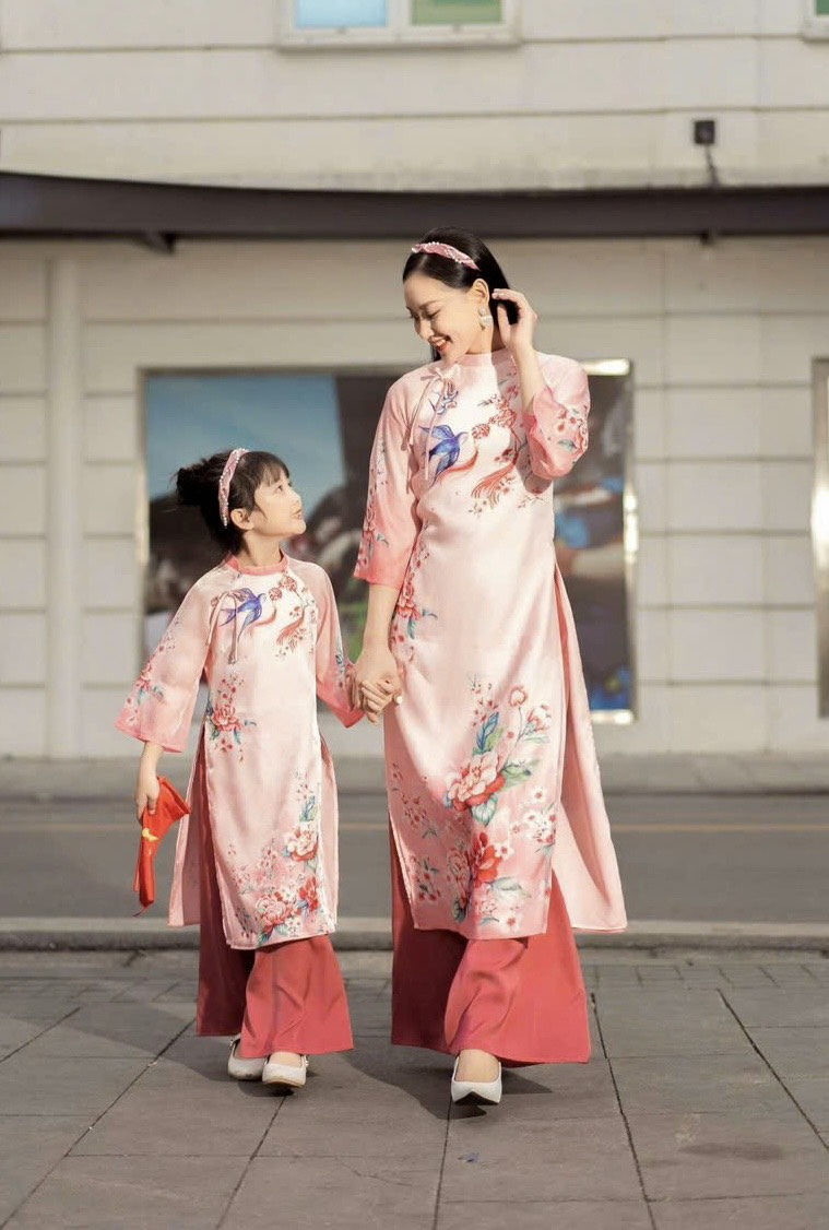 Áo Dài Cách Tân Mẹ Bé Lụa Hồng In 3D