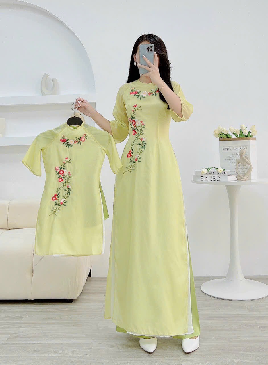 • Áo Dài Cách Tân Mẹ Bé Lụa Vàng Thêu Hoa