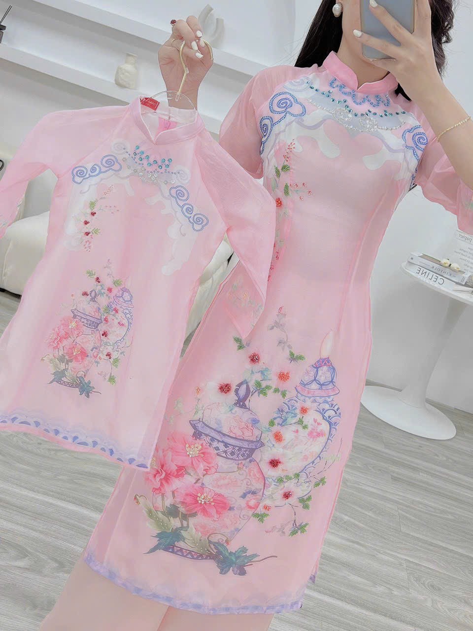 • Áo Dài Cách Tân Mẹ Bé Voan Tơ Hồng In 3D
