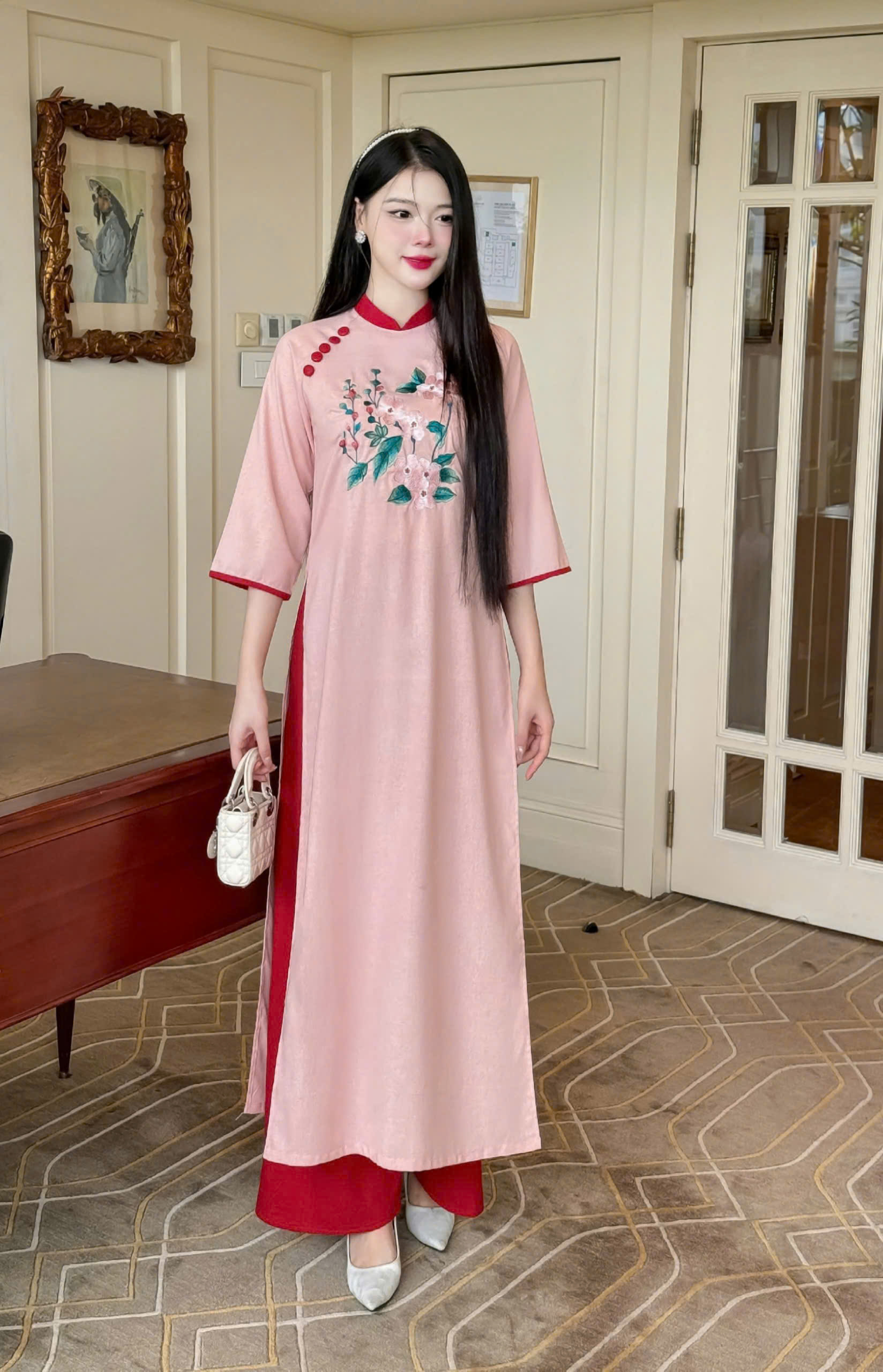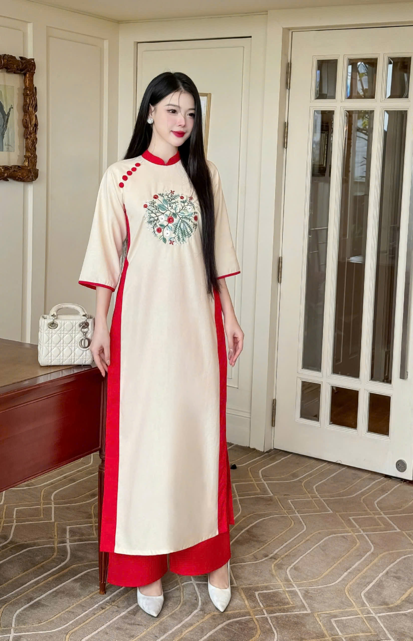 Một chiếc áo dài cách tân hiện đại khác là sự kết hợp giữa áo dài cách tân cùng chân váy xòe hoặc quần ống rộng. Nếu chọn chân váy, một chiếc váy xòe mềm mại như lụa sẽ mang đến cho bạn cảm giác bay bổng và năng động hơn. Còn nếu là sự kết hợp với quần ống rộng mang xu hướng hiện đại, thử chọn một chiếc culottes sẽ làm bạn thật trẻ trung khi bước ra đường.