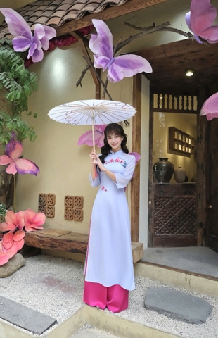 Áo Dài Cách Tân Vải Tơ Cao Cấp Thêu Hoa Xinh Xắn NU0518