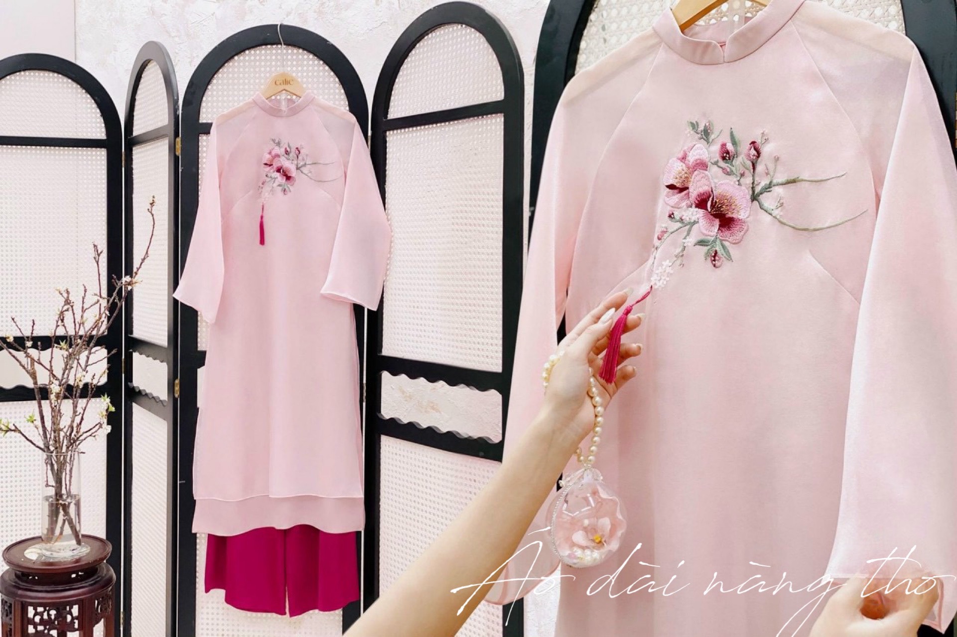 • Áo Dài Cách Tân Thêu Họa Tiết Hoa Xinh Xắn