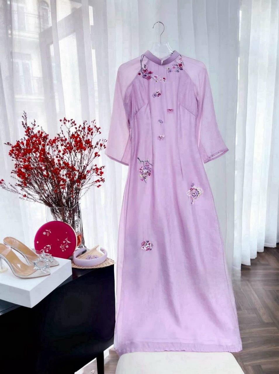 • Áo Dài Cách Tân Tím Thêu Họa Tiết Hoa Xinh Xắn