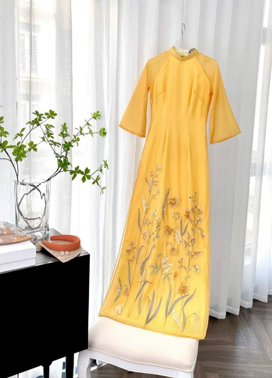 Áo Dài Cách Tân Vàng Họa Tiết Hoa Xinh Xắn