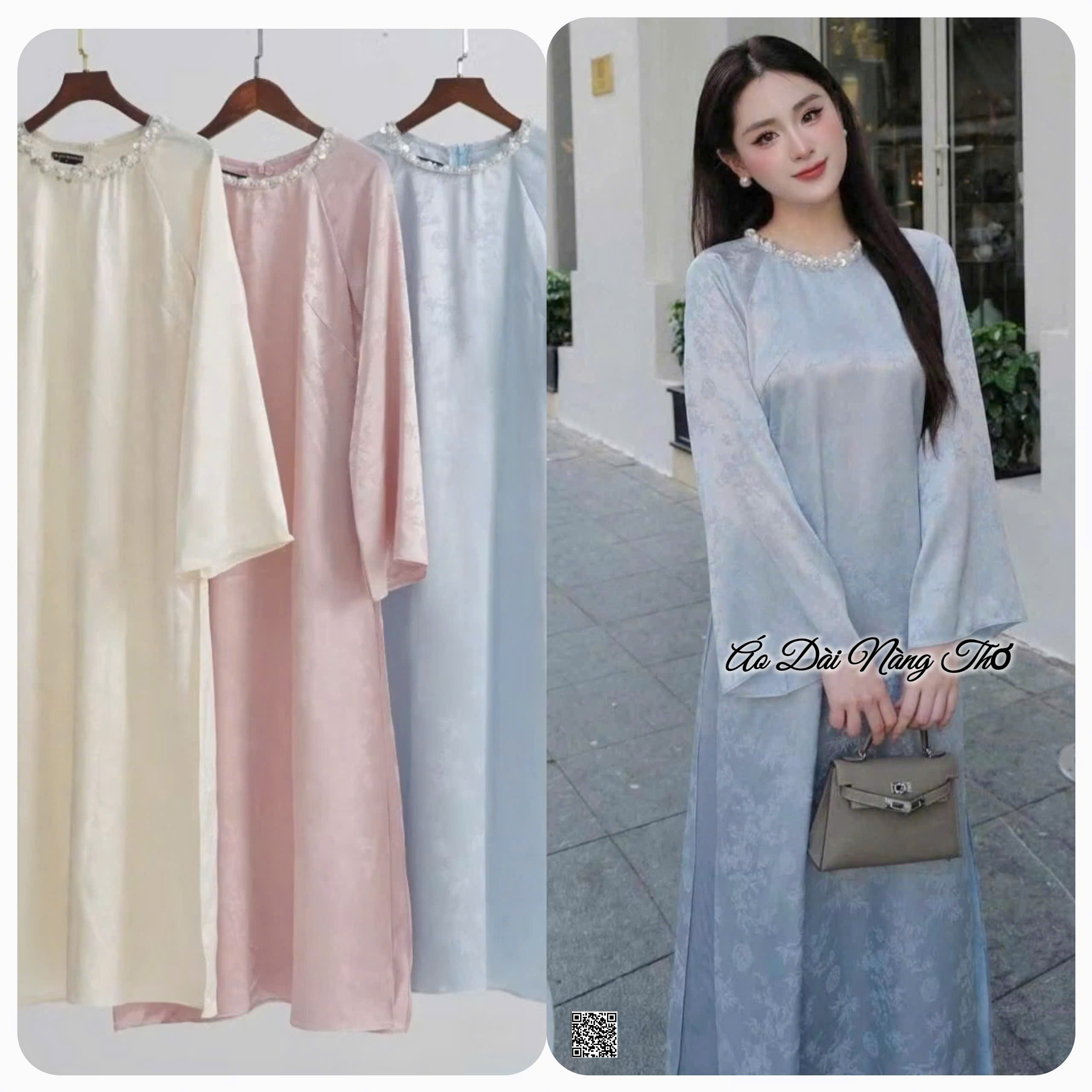 • Áo Dài Cách Tân Vải Gấm Lụa Cổ Tròn Kết Hạt Xinh