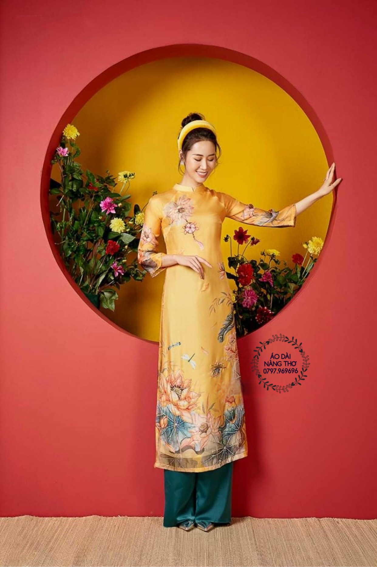 Áo Dài Cách Tân Vàng Tơ Hoạ Tiết Sen Nền Nã
