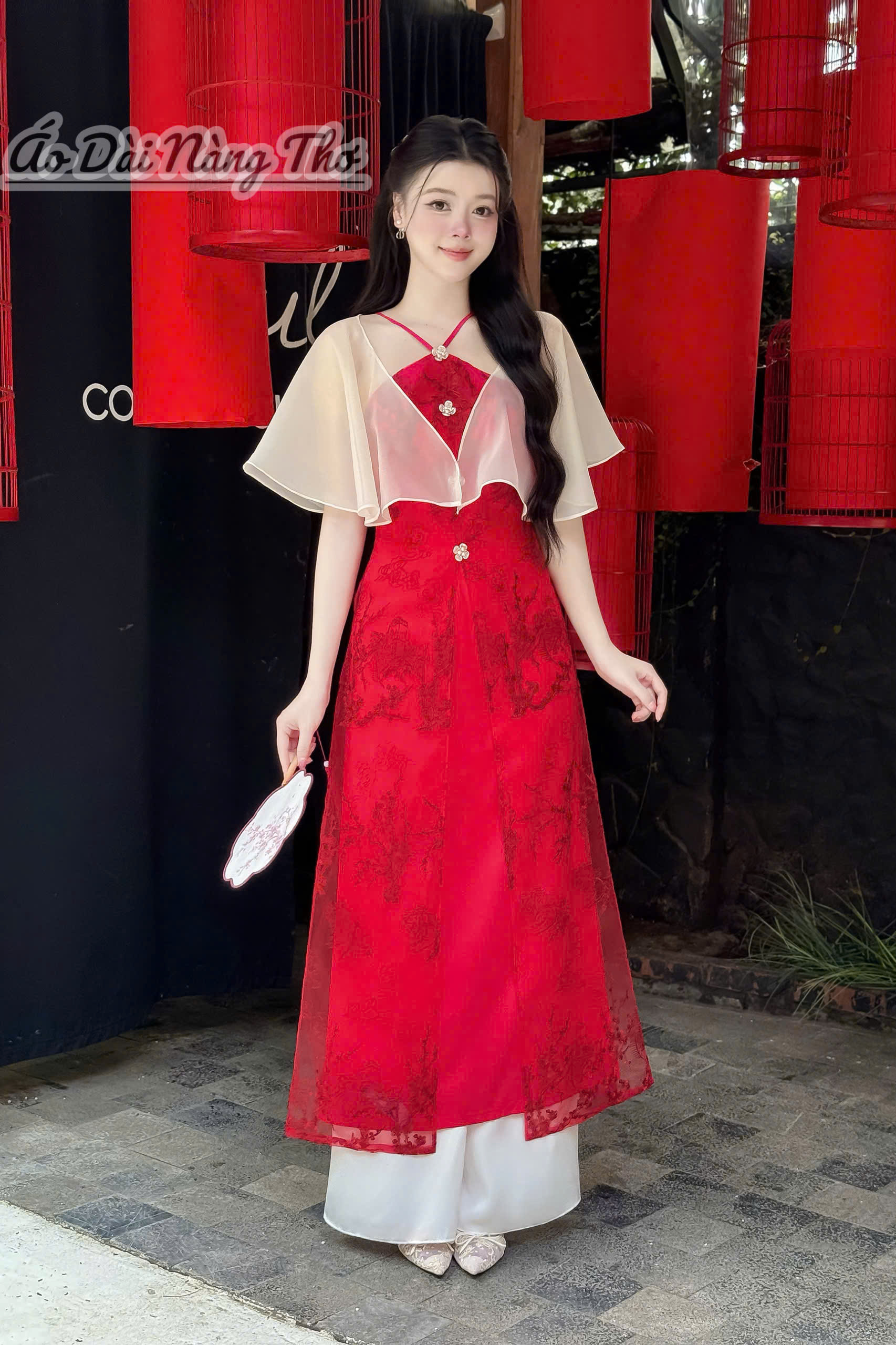 • Áo Dài Cách Tân Voan Đỏ Cổ Yếm