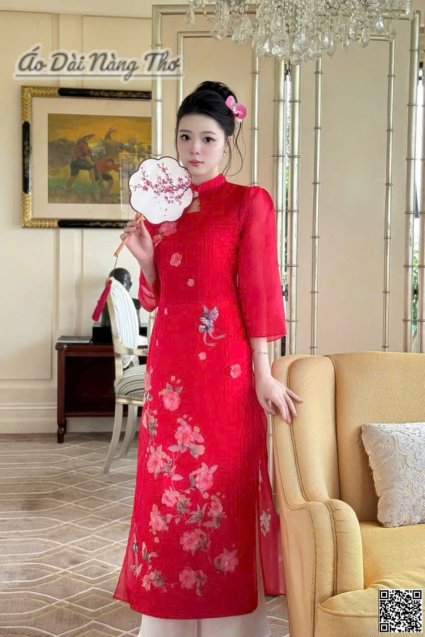 • Áo Dài Cách Tân Voan Đỏ Tay Lỡ Đáng Yêu