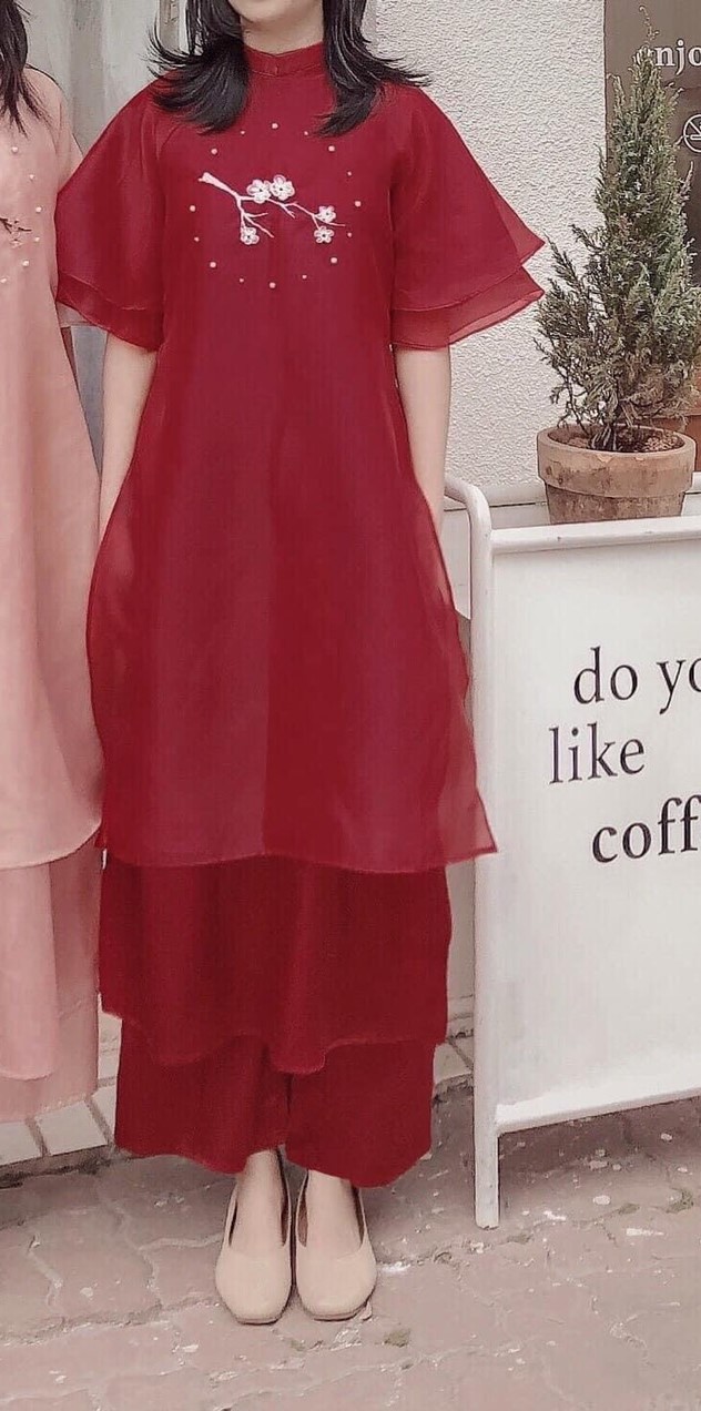 • Áo Dài Cách Tân Voan Tơ Đỏ Kết Hạt