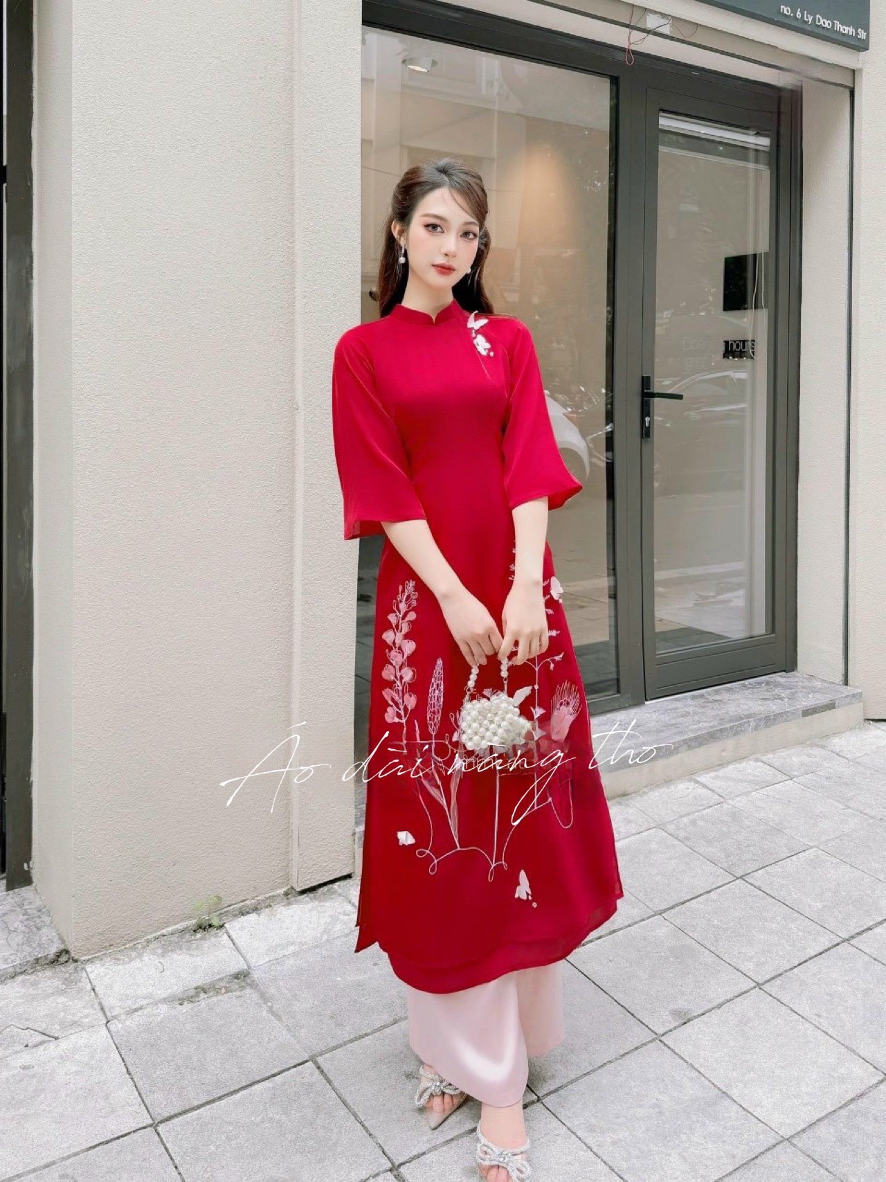 • Áo Dài Cách Tân Đỏ Thêu Hoa Nổi Bật