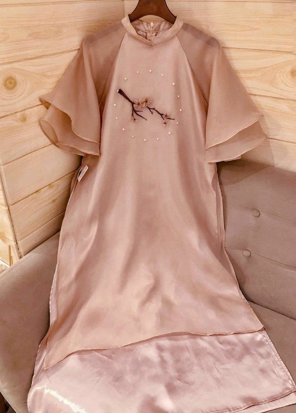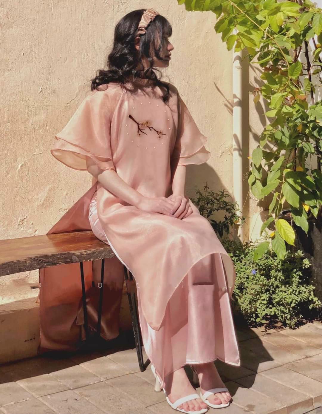 • Áo Dài Cách Tân Voan Tơ Hồng Tay Loe