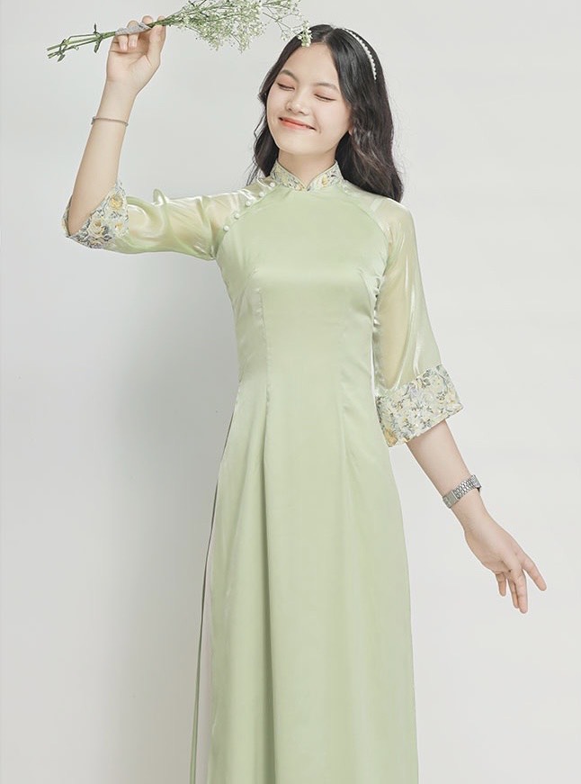 • Áo Dài Cách Tân Voan Tơ Màu Xanh Tay Lửng