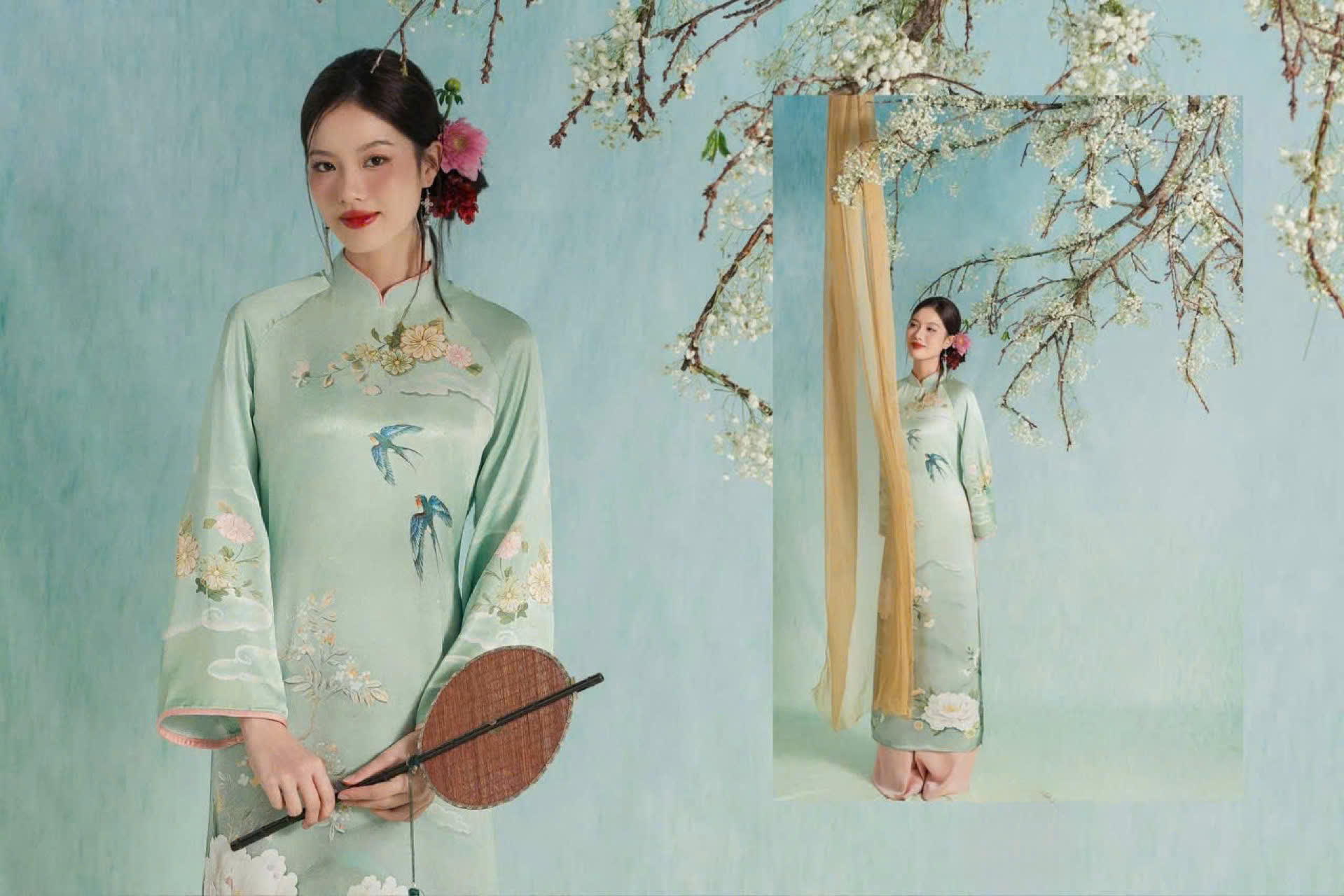 • Áo Dài Cách Tân Lụa In 3D Xanh Mint