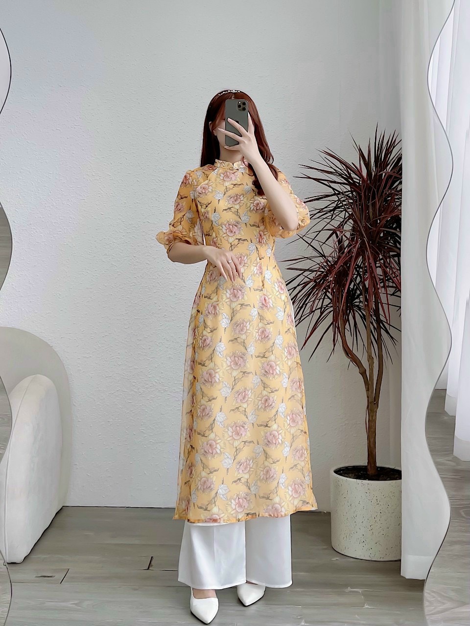 Áo Dài Cách Tân Voan Tơ Vàng Tay Lửng Hoa Li Ti