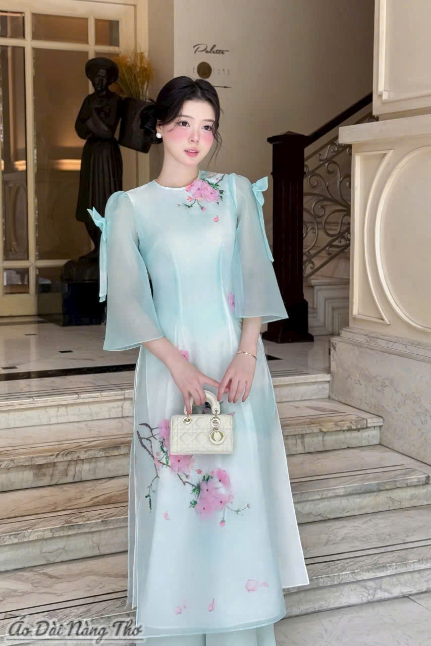 Áo Dài Cách Tân Voan Xanh Tay Lỡ Đáng Yêu