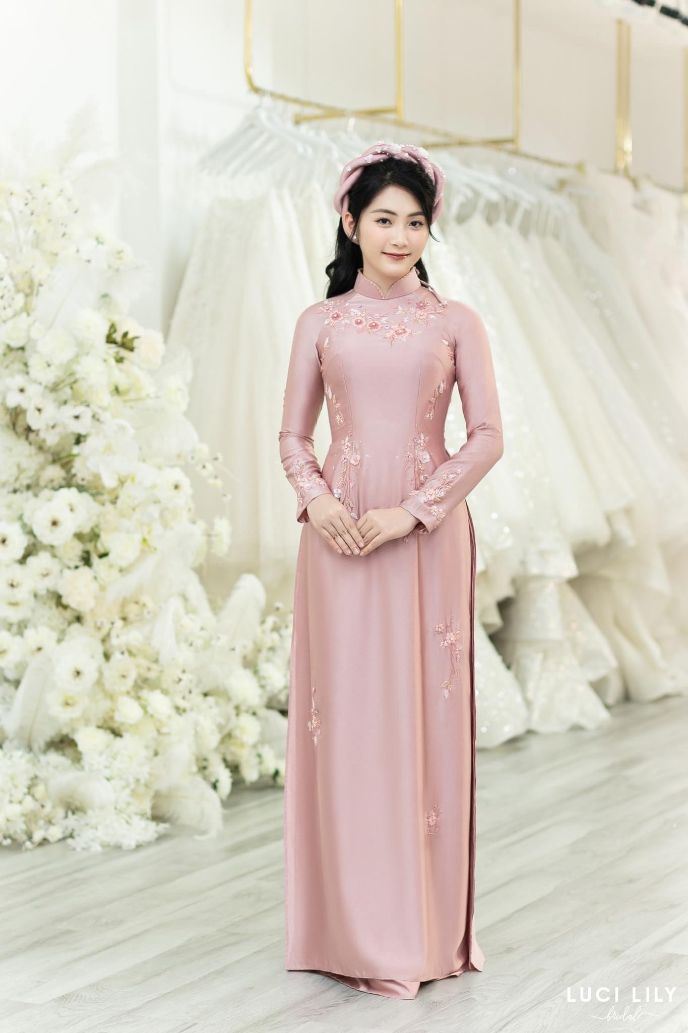 Áo Dài Cô Dâu Gấm Hồng Thêu Hoa Xinh Xắn