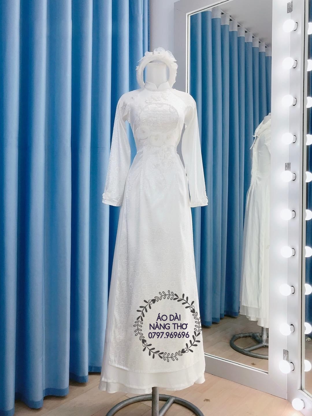 • Áo Dài Cô Dâu Gấm Tơ Tằm Màu Trắng Đính Hạt Kết Hoa Nổi