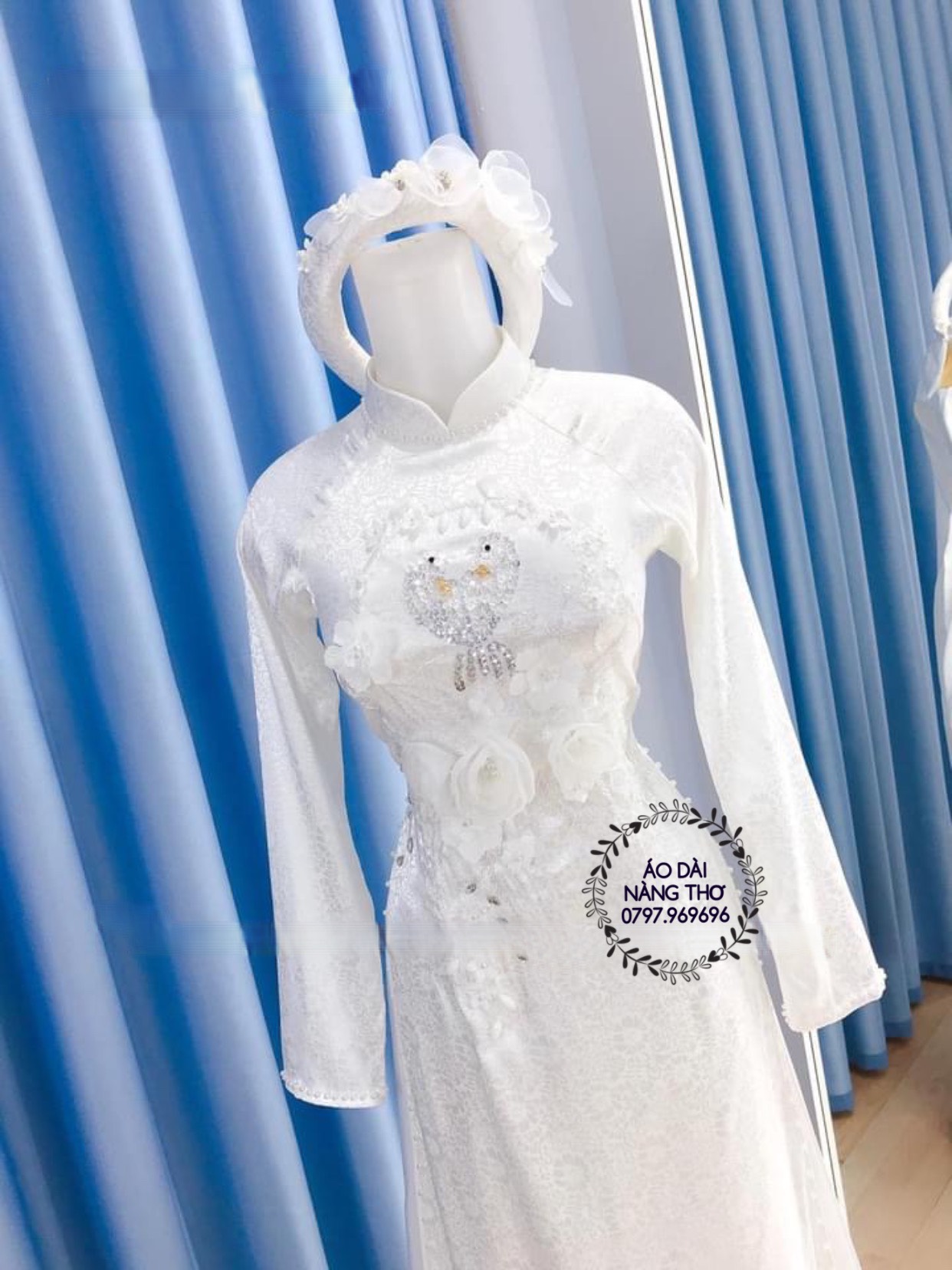 • Áo Dài Cô Dâu Gấm Trắng Thêu Họa Tiết Đẹp