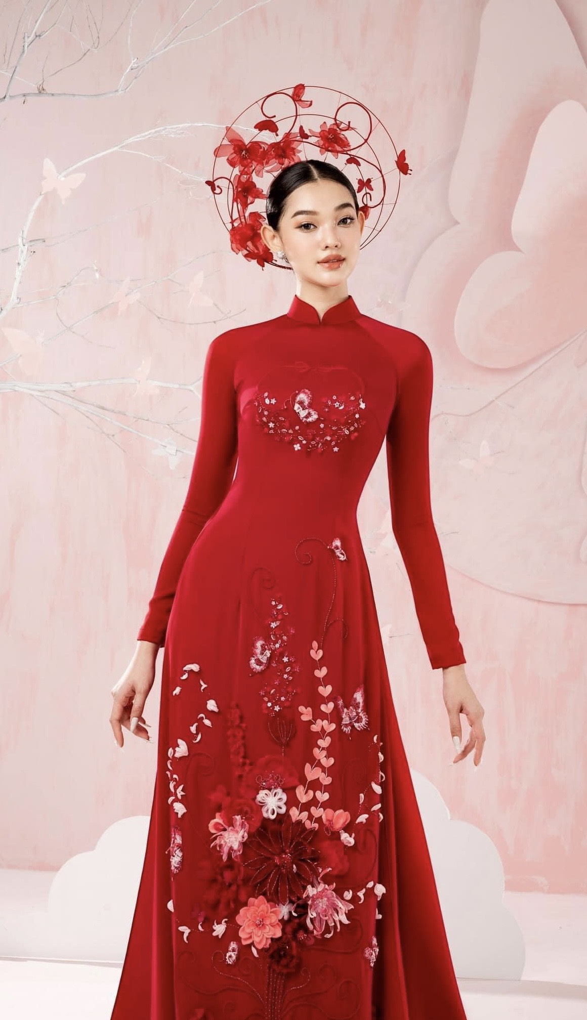 Áo Dài Cô Dâu Lụa Đỏ Đính Hoa Nổi Bật