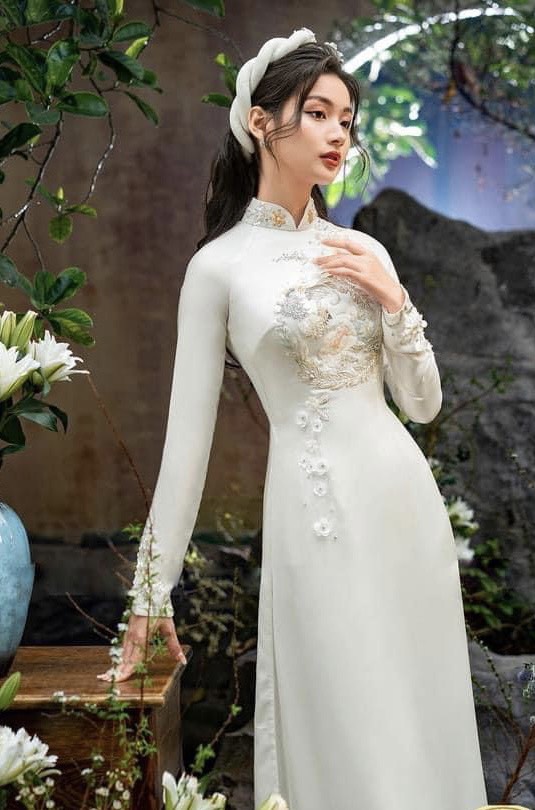 • Áo Dài Cô Dâu Lụa Trắng Thêu