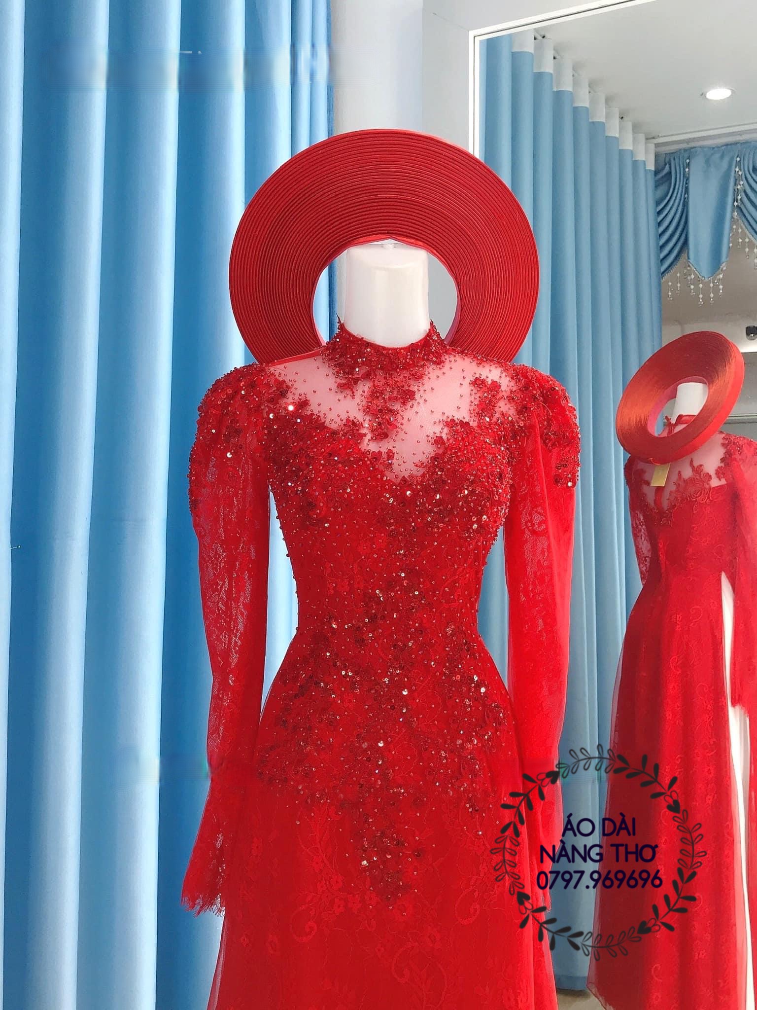 • Áo Dài Cô Dâu Ren Lưới Đỏ Kết Hạt Cao Cấp