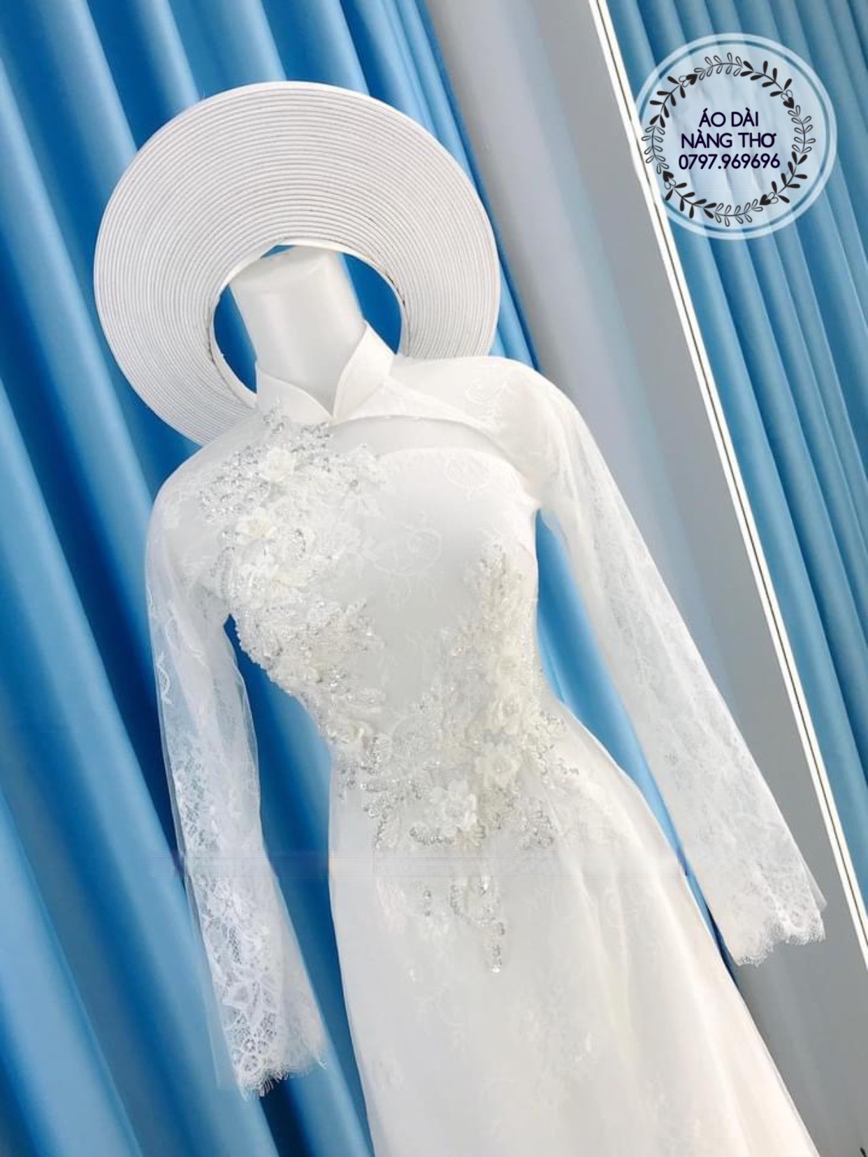 • Áo Dài Cô Dâu Ren Lưới Trắng Kết Hạt Họa Tiết Cao Cấp